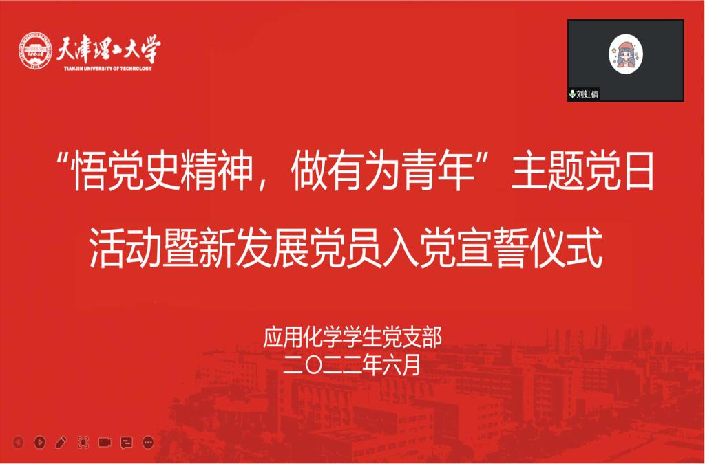 为迎接党的二十大胜利召开,激发学生党员爱国情怀,保持党员队伍生机活力,必威betway西汉姆联应用化学学生党支部于6月23日在19号楼511室以线上线下相结合的方式开展“悟党史精神 做有为青年”主题党日活动,并为6月新发展的预备党员举行入党宣誓仪式,支部全体党员参加此次活动。
